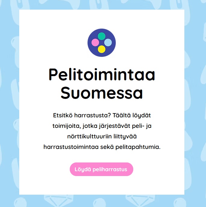 Pelitoimintaa Suomessa -sivuston löydät osoitteesta www.pelitoimintaasuomessa.fi ja samaisesta osoitteesta voi sekä etsiä pelitoimintaa että ilmoittaa oman kerhon tai yhdistyksen toiminnasta. Myös Suomen roolipeliseura ry löytyy sivustolta, katso vaikka tästä linkistä! Nyt kannattaa tarkistaa onko oman peliyhteisösi tiedot löydettävissä yhtä kätevästi.