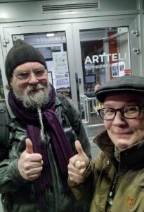 Sami ja Ruska onnistuneiden minipelien vetämisen jälkeen Arttelin ovien ulkopuolella.